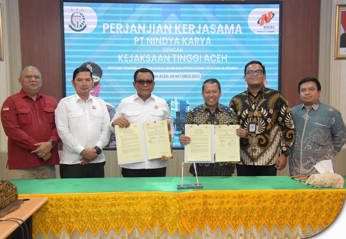 Radar Singkil ~ Banda Aceh | – Kejaksaan Tinggi (Kejati) Aceh bersama PT Nindya Karya menandatangani Perjanjian Kerja Sama (PKS) di bidang perdata dan tata usaha negara, Rabu (8/10/2025), bertempat di Aula Kejati Aceh.