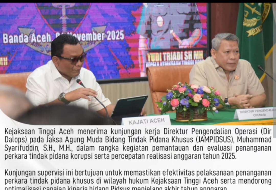 Radar,Banda Aceh | — Kejaksaan Tinggi (Kejati) Aceh menerima kunjungan kerja Direktur Pengendalian Operasi (Dir Dalops) pada Jaksa Agung Muda Bidang Tindak Pidana Khusus (JAMPIDSUS), Muhammad Syarifuddin, S.H., M.H., dalam rangka kegiatan pemantauan dan evaluasi penanganan perkara tindak pidana korupsi serta percepatan realisasi anggaran tahun 2025, Kamis (6/11/2025).