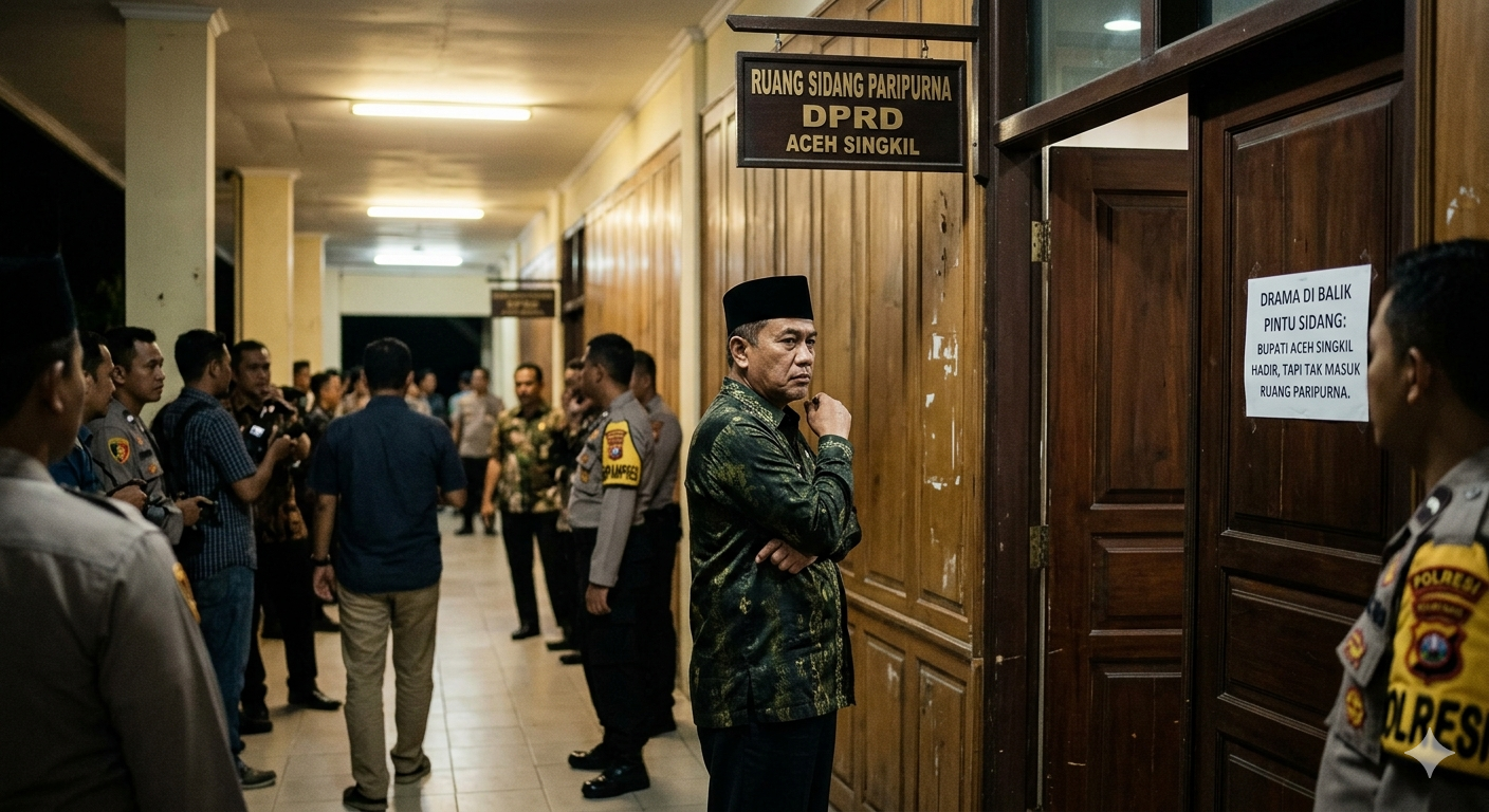Sorotan tajam tertuju pada sosok Bupati Aceh Singkil. Meski diketahui telah berada di lokasi acara, sang kepala daerah secara mengejutkan tidak menampakkan diri di dalam ruang sidang. Ketidakhadirannya di kursi utama forum resmi tersebut membuat jalannya rapat paripurna terhenti di tengah ketidakpastian.